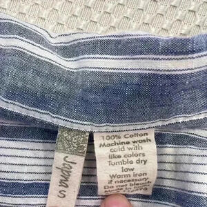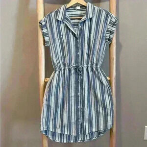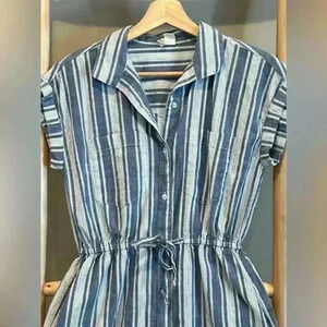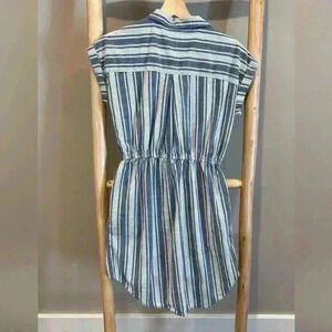 Japna Woven Mini Dress Striped button down Short Sleeve Blue White Elastic waist Size small with pockets