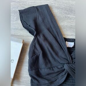 Japna ruffle sleeve knotted front smocked back crop top in black. Size S