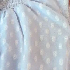 Has a sweet, romantic feel with it’s chiffon look and dot print. Features a flattering smocked waist with give and a mock neck. Blouse is double lined in entire bodice, except neck and bottom peplum ruffle which is more sheer. Dress up or down.