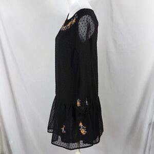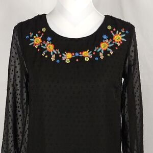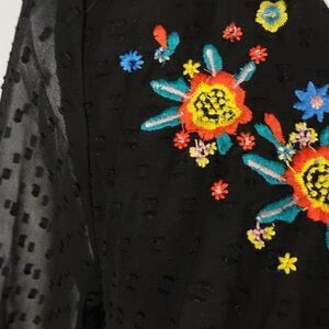 This black floral embroidered Japna smock dress is a size XS with a pit to pit measuring 18" with a length of 33". It has long sheer sleeves with colorful florals embroidered on each cuff. Fully lined except for sleeves. Has a button and hoop closure in back. 100% polyester and machine washable. Pre-owned and in excellent condition. All offers welcome.