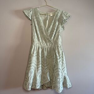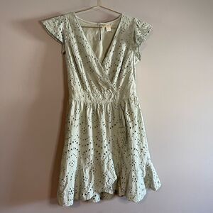 Stunning little light green (almost like a light sage) flutter sleeve eyelet embroidered dress from Japna, in a size large. Featuring V-surplice neckline, smocked back waistband, and faux wrap style skirt with ruffle hem; fully lined.