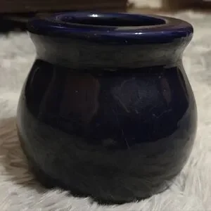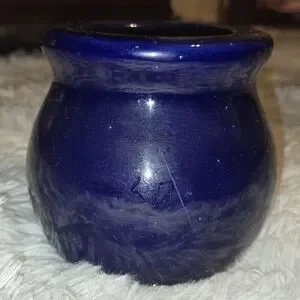 Dark blue glass jar. Approx. 4 inches tall and 4 inches wide. Reads 'Mall Money'. Great for keeping spare change. Offers welcomed.