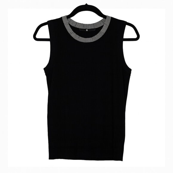 keywords: black sweater top, cashmere knit, classic layering piece, designer knitwear, everyday luxury layer, minimalist chic, modern essential, office to weekend, polished basics, quiet luxury, sleeveless sweater, timeless wardrobe