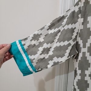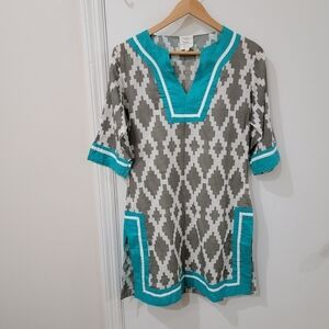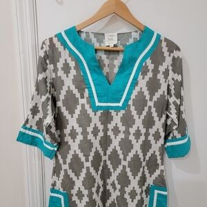 Pretty lightweight cotton gray and teal tunic dress. Gray and white geometric print with aqua / teal blue trim. Lightweight, thin breathable material. Slightly see through.