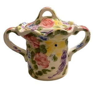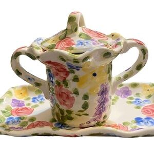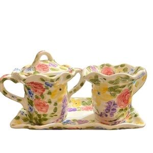 Jardine handpainted table tops, unlimited collection. beautiful floral English garden, type design creamer, and sugar with tray.