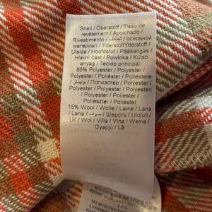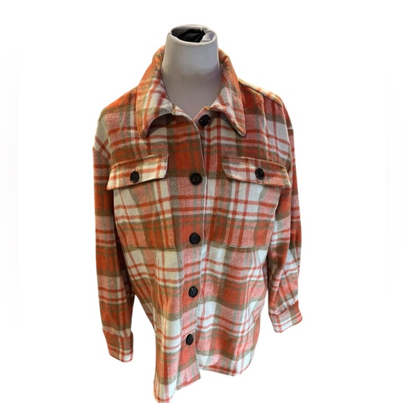 Women’s new-with-tags Jardines Domaine orange, tan, cream plaid jacket. Stay stylish and warm with this plaid jacket. Perfect for any casual outing. Two front pockets. Size tag has been removed - estimate size L/XL (see pictures for measurements).