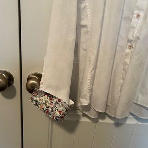 Jared Lang slim fit white buttoned down shirt with designs on neck and wrist. No rips or stains