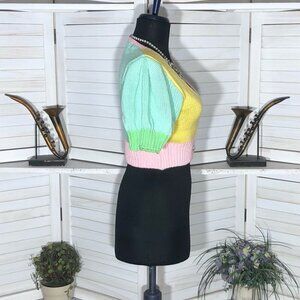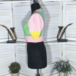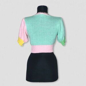 Brighten your wardrobe with this Y2K-inspired cropped knit top from Jarinya, featuring bold color blocking in pastel pink, green, yellow, and blue. The fitted waist and short puff sleeves create a flattering retro silhouette perfect for warm weather.