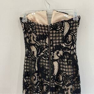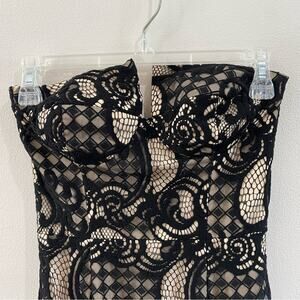 Bandeau neckline with v plunge, padded cups, contrast mesh fishtail underlay, zip back with hook and eye fastening, close cut bodycon fit.