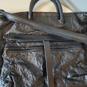Beautiful Crinkled Effect Black Leather, Dual Top Handles with Snap Closure, Canvas & Leather Shoulder Strap with/17" Drop, Logo Embossed on Both Sides of Bag, Front Strap Accent with Removable 6 X 12" Pouch, Clean Textile Lining with 1 Large Leather Slip Pocket, Bag Measures approx. 19" T X 17" W, Like New Condition, No Wearing/Corners/Stains, Used Once, Embroidered Dust Bag:) Rt.695.00 approx. * Jas M.B. Designs Unisex Bags for Travel-Everyday. ** Last Photo are People who Love this Brand.