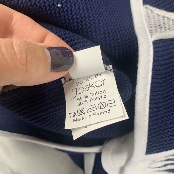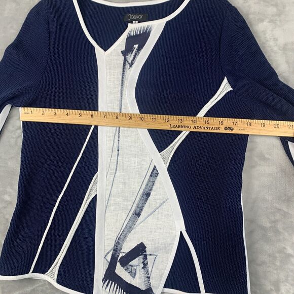 Keywords: Joskar jacket, navy blue jacket, white abstract print, knit jacket, womens jacket, designer jacket, modern jacket, artistic jacket, size S, long sleeve jacket, v neck jacket, casual jacket, unique outerwear