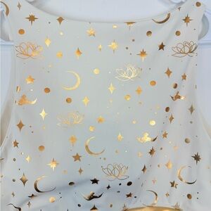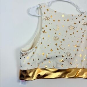 Bra Active Wear Top. Plus Size 1X. In good preowned condition. No stains or holes. Off white Jasmine active wear top. The allover metallic golden pattern features Jasmine flying a magic carpet in silhouette amid a flurry of pretty icons inspired by Disney's Aladdin. All this and the shimmery golden wrap detail and flattering sports crop top fit prove active wear can be as fierce as the person wearing it.