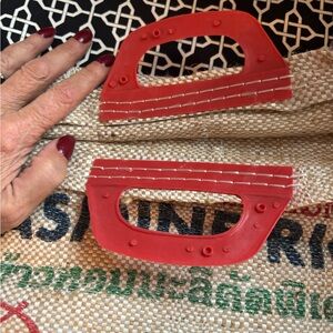 Premium burlap bag featuring branding. Natural brown color with vibrant red and green accents. Perfect for storage or decor.
