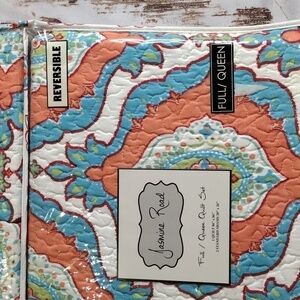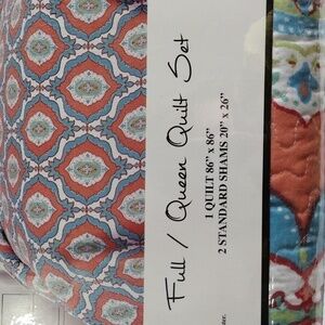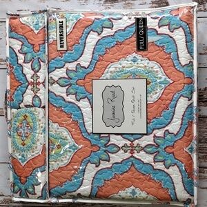 New in package coral/peach, blue, green, and white patterned reversible full/queen quilt with 2 matching pillow shams. See last pic for the reversed side print. Beautiful vibrant colors!