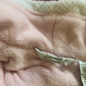 Jasmine Rose Intimates Extra Large Long Pink Robe. Rolled Collar. Embroidered Breast Cancer Ribbon on left side. Two pockets trimmed in white. Belt included. Very Soft and Comfy. 100% polyester. Has small snag near right lapel shown in picture.