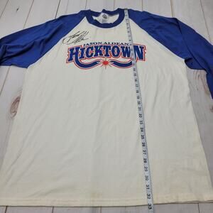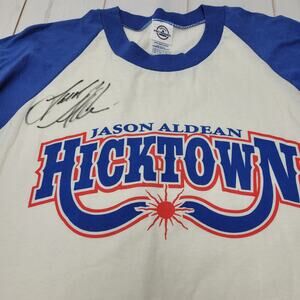 Nice Jason Aldean "Hicktown" autographed T-Shirt! Baseball tee style with blue contrast arms and a large logo. Shirt has quite a bit of staining on lower portion of shirt along with some speckle stains. Size XL