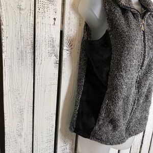 fuzzy fleece, zip vest, outdoor apparel, hiking layer, cozy vest, black gray, petite fit, camping gear, warm outerwear, fleece vest