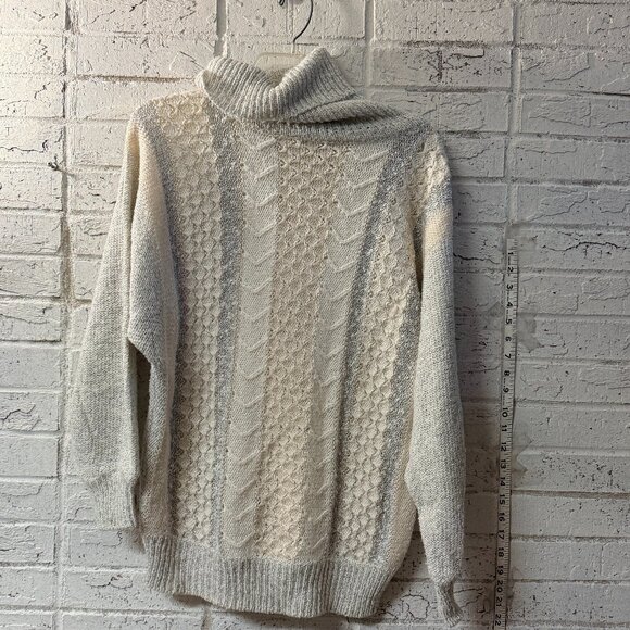 Stay cozy and chic with this gorgeous Jason Maxwell vintage knit sweater in a soft neutral palette of cream, oatmeal, and heather grey. Features a chunky textured cable-inspired pattern, subtle shimmer yarn details, and a warm foldover turtleneck—perfect for winter, holidays, or snuggle-season styling.