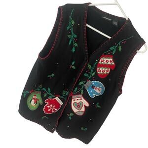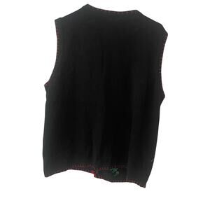 The product is a vintage Jason Maxwell sweater in size Large for women. This black cardigan features a festive Christmas theme with sequin bird accents, making it perfect for travel, parties, or casual wear. The tight-knit fabric and collared neckline with long sleeves provide a comfortable and stylish fit, especially for the holiday season. The embroidered and rhinestone details add a touch of sparkle to this unique and eye-catching piece.