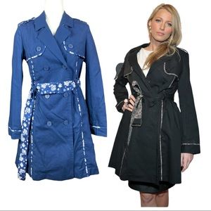 Jason Wo x Target worn by Blake Lively from Gossip Girls navy Blue double breasted trench coat. From Spring 2012, NEW WITH TAGS, rare find collaboration. Knee length, side pockets and military shoulders. Contrast extra long floral belt and trim details.