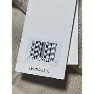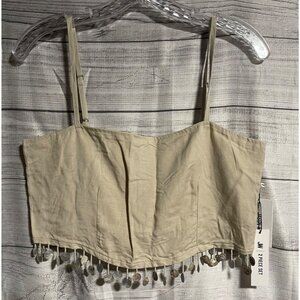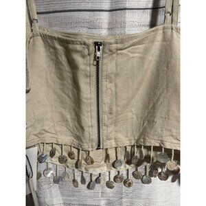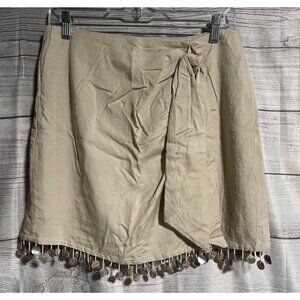 Stylish 2-piece set featuring a crop top and wrap skirt with coin trim detail. Made of breathable rayon-linen blend. Brand new with original tags attached. MSRP $425.00 Rayon/Lyocell blend with polyester/cotton lining. Dry clean only. Both top and bottom zip closed in back.