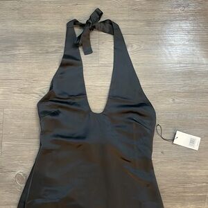 Black satin halter style dress, featuring plunging U neckline, ties at back neck, hidden back zipper, midi length, and back hem vent.
