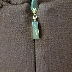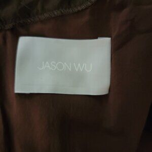 The Jason Wu brown sheath dress features a sophisticated draped design with 3/4 sleeves. Ideal for enhancing one's professional wardrobe with elegance.
