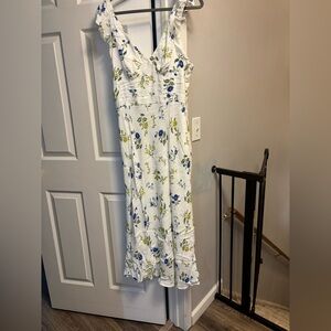 The Jason Wu Collection White Floral Ruffal V Neck dress in size 10 is a stunning choice for any special occasion. This designer dress features a beautiful floral pattern, a flattering V-neckline, and a fit and flare style that is perfect for weddings, parties, and more. The sleeveless design and flutter sleeves add a touch of elegance, while the midi length and zipper closure make it easy to wear. Made from a luxurious blend of polyester, rayon, and viscose, this dress will have you looking like a princess all summer and spring long.