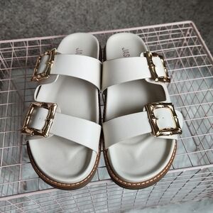 Elegant cream sandals with striking gold accents. Perfect for casual elegance.
