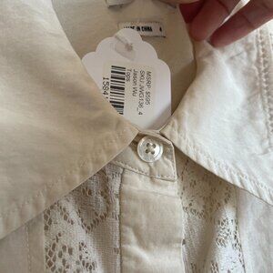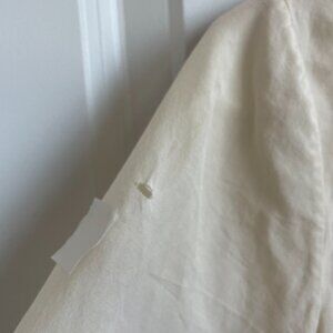 Off-white cotton blend (70% Cotton, 30% Silk). Short sleeves. Collar. Front button closure. 16.5" from shoulder to hemline. Imported.