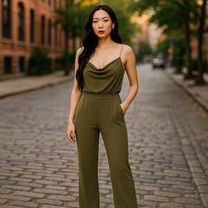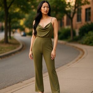 Jason Wu Size M Green Gold Cowl Neck Flare Leg Jumpsuit
