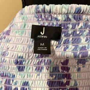 Features: halter neckline with two-ply tie and keyhole; allover printed; elastic waistband and across back; smocked back panel; lined bodice