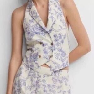 Elevate your style with this stunning Jason Wu top done in a beautiful white and blue floral pattern. A halter style collared Vest like top with 4 buttons. Made from a blended fabric of linen, rayon, and poly. Stunning with pants or skirt. In beautiful pre owned condition, never been worn. Measurements: Pit to pit: 17” Length: 16 1/2”