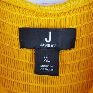Jason Wu Mustard Yellow Ruffle Midi Dress Size XL Cottage Whimsy Stretch Ruched
