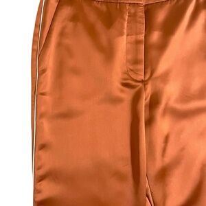 Elevate your style with these chic Jason Wu satin pants in a striking orange hue with crisp white side stripes. Tailored yet sporty, they’re perfect for dressing up with heels or down with sneakers.