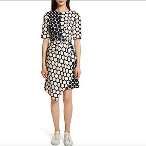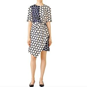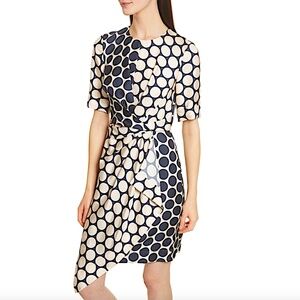 Bold polka dots in inverse colorways add trendy, graphic style to to this artfully gathered silk dress.