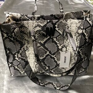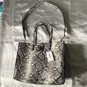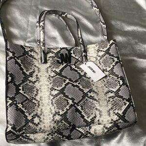 Elevate your style with the Snake Print Tote Bag. This chic accessory features a striking black and gray pattern, perfect for any occasion. Carry your essentials in style with this versatile and fashionable bag.