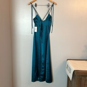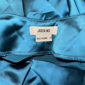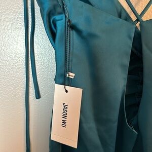 NWT Jason Wu Satin slip dress in a deep emerald green. Self tie straps over shoulders(non-adjustable). Satin fabric with a stretch. Hidden zipper closure on the side. Criss cross open back with a scooped design. Ruched front design. A-line style. Size Medium, from a smoke free home.