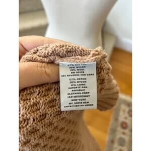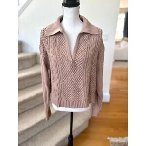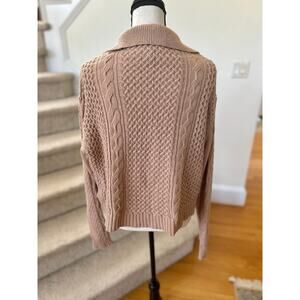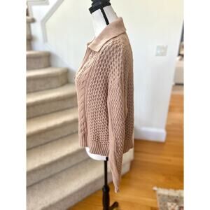 Excellent condition. Tan, light brown lightweight knit. Cableknit design, long sleeves, johnny collar.