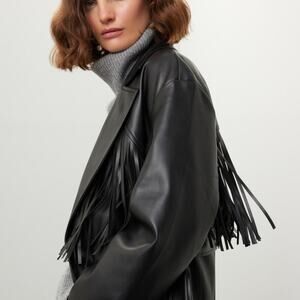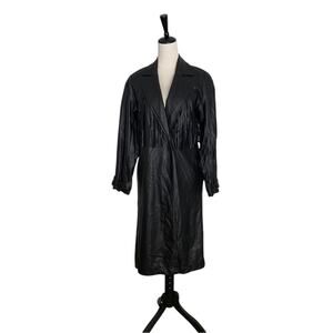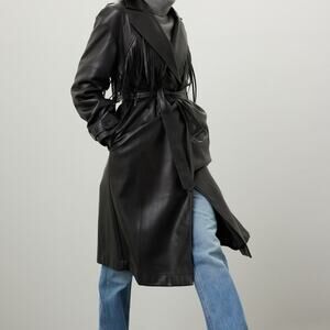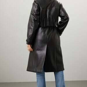 Stylish black vegan leather trench coat. Features fringe details. Perfect for a trendy look. Cowgirl but make it fashion, this long fringe details give a western-inspired look to this tie waist trench by Jason Wu Collective. Belt is missing otherwise in great condition. Size XS.