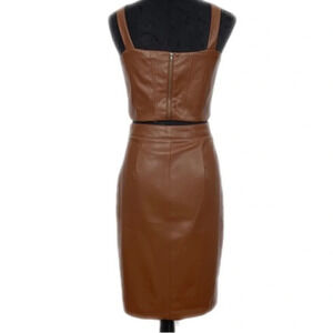 Sleek and modern, this Jason Wu two-piece set is crafted in rich cognac vegan leather. Includes a structured crop top with wide straps and a matching high-waist pencil skirt for a chic, runway-inspired look. Perfect for a night out, special event, or fashion-forward statement.