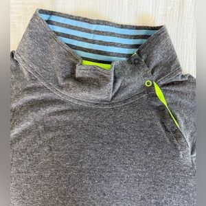 Elevated and rare Jason Wu for EVA Air men’s pullover in heather gray. Features a modern mock neck with bold blue stripe + neon green trim accents, quarter snap closure, and subtle “Jason Wu” sleeve logo. Lightweight stretch fabric makes it ideal for travel, lounging, or layering. Exclusive airline collaboration piece, hard to find in this condition.