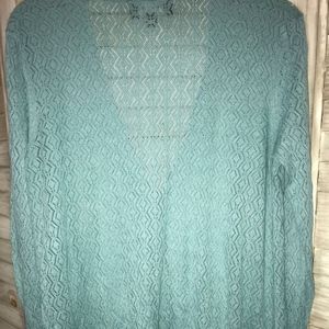The sweater is incredibly soft, a beautiful sky blue and light enough for spring and summer! The front has snap closures and two open pockets.