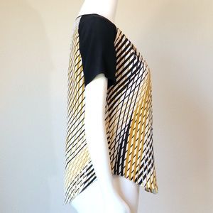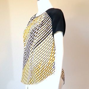 Size 2 Jason Wu 100% silk top in a geometric striped pattern of black/yellow/white Raglan short sleeves in black, round neckline trimmed in black, shirttail hem in front and back Excellent condition approximate measurements laid flat 18" bust & waist 19" hips 8" sleeves 23" length