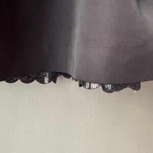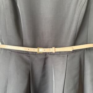 This is a pre-owned Jason Wu for Target black dress, size 12. The dress features a sleeveless design, a round neckline, and a fitted bodice. It includes a light pink belt with a gold-tone buckle. The skirt is pleated and has a lace trim at the hem. The shell is made of 91% polyester and 9% nylon. There are no visible stains or tears."