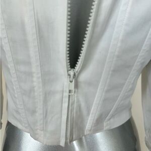 This chic white blouse by Jason Wu features elegant puff sleeves and a fitted bustier design, creating a sophisticated silhouette. The 3/4 length sleeves and cropped style add a modern touch to this timeless piece, perfect for elevating any ensemble.