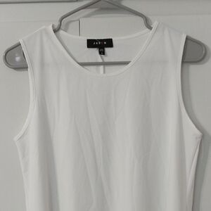 Tank top has a high crew neckline. Stretchy fabric falls nicely over hips.