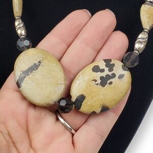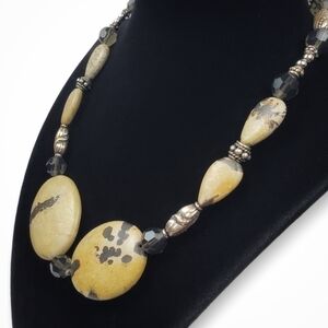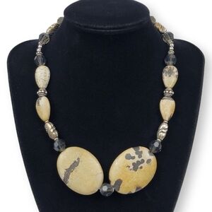 Jasper Beaded Statement Necklace Tan Gray Oval Natural Stone Silver Tone 19"