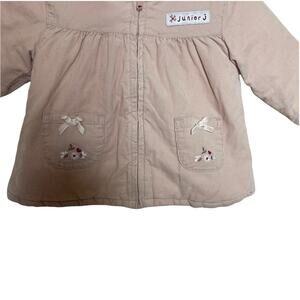 Features- quilted interior, hooded, front zip, corded, front pockets, embroidered detail, 100% Cotton, Baby