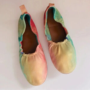 Watercolors blend together to create a vibrant take on the classic ballet flat.
